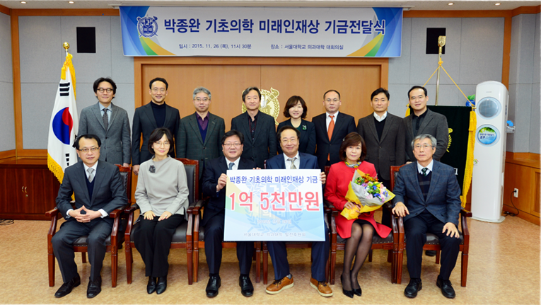 서울대학교 의과대학 박종완 교수(약리학교실)의 ‘박종완 기초의학 미래인재상 기금전달식’이 11월 26일일(목) 행정관 대회의실에서 있었다. 박종완 교수는 기초의학 연구증진을 위해 총1억 5천만원의 기금을 약정했다. 이 날 행사에는 의과대학 학장단을 비롯하여 기초교실 주임교수 및 약리학교실 교수 전원이 참석하여 자리를 빛냈다.